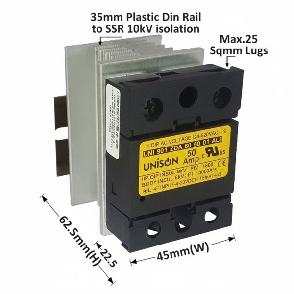 The Model 901 ZDA is a high-performance Zero Cross DC to AC Solid State Relay, engineered for silent, spark-free switching of AC loads. Designed to deliver smooth power control with exceptional reliability, it is an ideal solution for industrial heating, automation panels, and process control systems where precision and durability matter.